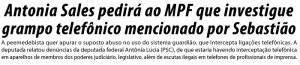 Ray Melo, da redação de ac24horas raymelo@ac24horas.com A deputada Antonia Sales (PMDB) pedirá ao Ministério Público Federal (MPF), que investigue o grampo telefônico mencionado pelo