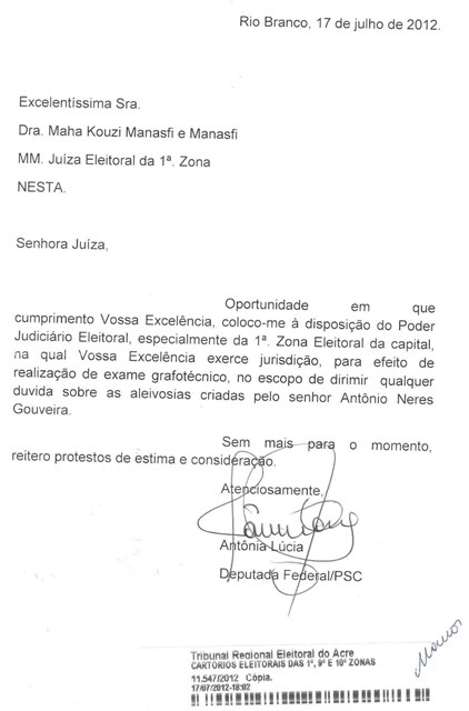 Ray Melo, da redação de ac24horas raymelo@ac24horas.com A candidata à prefeita de Rio Branco, deputado federal Antônia Lúcia (PSC), protocolou documento na tarde de ontem,