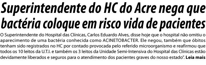 O Superintendente do Hospital das Clínicas, Carlos Eduardo Alves, disse hoje que o hospital não omitiu o aparecimento de uma bactéria conhecida como ACINETOBACTER. Ele