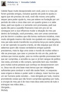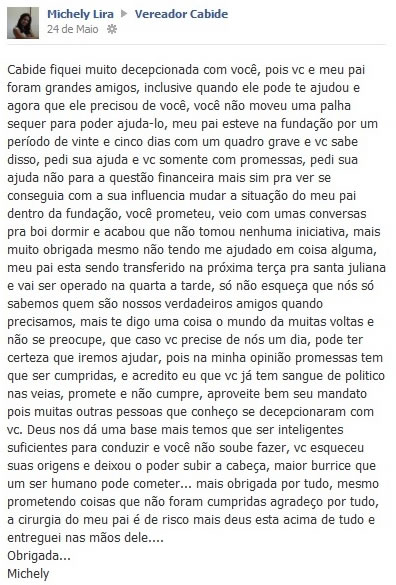 A estudante Michely Lira disse em mensagem direcionada no facebook ao vereador Cabide que ele “esqueceu suas origens” e que “deixou o poder subir a