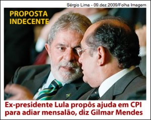 Da Folha, DE BRASÍLIA O ex-presidente Lula procurou o ministro do STF (Supremo Tribunal Federal) Gilmar Mendes para tentar adiar o julgamento do mensalão. Em