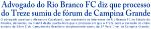 Por Phelipe Caldas, de João Pessoa O advogado paraibano Alexandre Cavalcanti, que representa os interesses do Rio Branco-AC no Estado, denunciou na manhã desta quarta-feira
