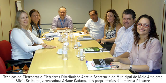 Técnicos da Eletrobras e Eletrobras Distribuição Acre, a Secretaria de Municipal de Meio Ambiente Silvia Brilhante, a vereadora Ariane Cadaxo, e os proprietários da empresa