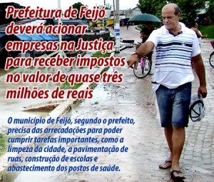 A prefeitura de Feijó deverá entrar com uma ação na Justiça contra as empresas que devem quase três milhões de reais de Imposto Sobre Serviço