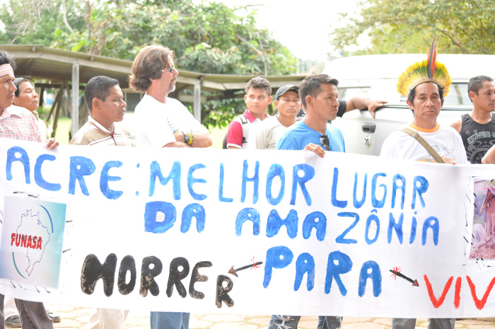 Cerca de 200 índios da tribo Jaminawá acabam de invadir a sede da Fundação Nacional do Índio – FUNAI, em Rio Branco. Eles estão caracterizado