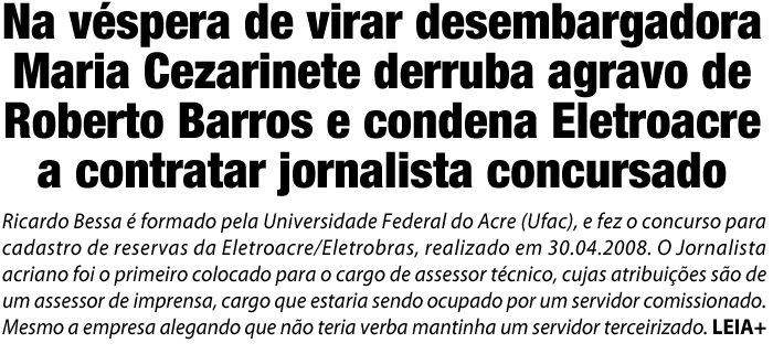 Ray Melo, da redação de ac24horas raymelo.ac@gmail.com Em sentença divulgada nesta quarta-feira, 11, a Juíza de Direito Maria Cezarinete de Souza Augusto Angelim derrubou o