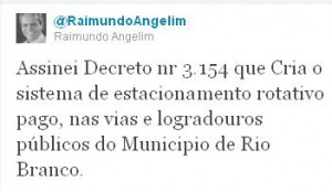 Salomão Matos, da redação de ac24horas salomao.matos@gmail.com O prefeito de Rio Branco, Raimundo Angelim (PT), informou em seu micro-blog do twitter, na tarde desta segunda-feira
