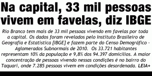 Jairo Carioca, da redação de ac24horas jscarioca@globo.com Rio Branco tem mais de 33 mil pessoas vivendo em favelas por toda a capital. Os dados foram