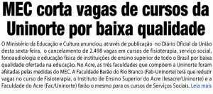 O Ministério da Educação e Cultura (MEC) anunciou, através de publicação no Diário Oficial da União (DOU) desta sexta-feira (02), o cancelamento de 2.498 vagas