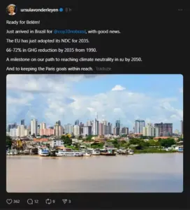 A presidente da Comissão Europeia, Ursula von der Leyen, anunciou nesta quarta-feira (5) sua chegada a Belém (PA) para participar da 30ª Conferência das Nações