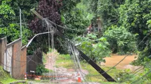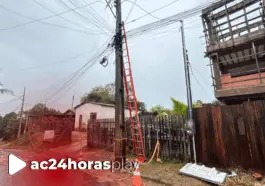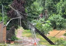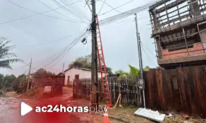 No bairro Geraldo Fleming, equipes da Energisa trabalham no restabelecimento da energia durante forte chuva. A distribuidora acionou o plano de contingência, reforçou as equipes