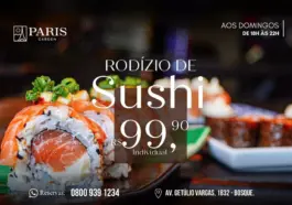 O restaurante Paris Garden, em Rio Branco, segue oferecendo rodízio de sushi todos os domingos, das 18h às 22h, ao valor individual de R$ 99,90.