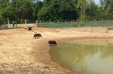 Após quase um mês, a família de antas composta por Flor, Bruno e pelo filhote Juninho, retornou ao açude do Parque Ambiental Chico Mendes, localizado