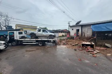 Uma caminhonete Nissan Frontier 4×4, de cor prata, placa MZU-6633, colidiu violentamente contra um muro e a frente de uma residência na esquina da rua