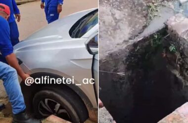 Um carro caiu em um buraco no cruzamento das ruas Dourado e São Francisco, no conjunto Tangará, em Rio Branco, por um problema que existe