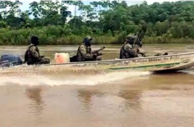 Militares do Grupamento de Operações Especiais, da Polícia Militar de Cruzeiro do Sul, chegavam a uma localidade no Rio Juruá Mirim, no último sábado, 14,