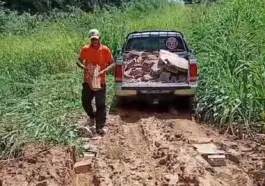 Toyoteiros improvisam espalhando pedras quando a chuva oferece trégua, mas a tabatinga é mais forte e inviabiliza trânsito Agricultores do Ramal do Barro Alto mostram