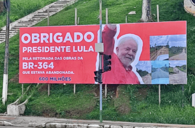 Um outdoor localizado ao lado da escadaria do Colégio São José, em Cruzeiro do Sul, agradece Lula pela destinação de R$ 600 mi para recuperação
