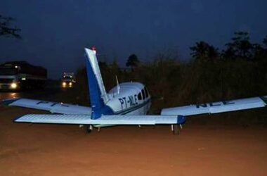 Foto: avião para à beira da BR-364 após pane – Flávio Afonso de Carvalho/G1 O avião monomotor de matrícula PT-NLE que fez um pouso forçado