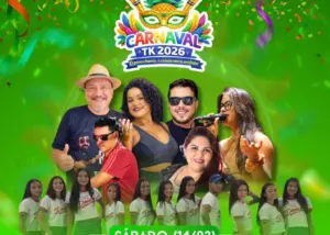 O Carnaval TK 2026 será realizado de 14 a 17 de fevereiro, na Praça Municipal Alton Furtado, em Tarauacá, com quatro noites de programação que