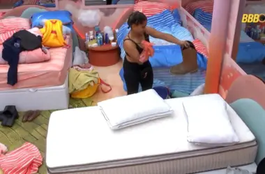 Cátia Paganote se irritou na noite de sábado, 11/05, em A Grande Conquista 2! A ex-Paquita ficou chateada ao perceber que sua toalha sumiu no