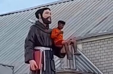 Um homem cuja identidade ainda não foi revelada foi filmado nessa quarta-feira, 29, no momento em que sentou na mão da estátua de São Francisco,