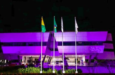 O prédio da sede do Tribunal da Justiça do Acre (TJAC) está iluminado na cor lilás, anunciando mais uma vez o engajamento da instituição no