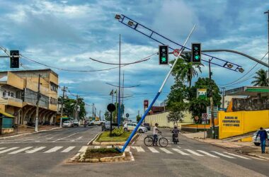 Um poste de iluminação pública caiu na avenida Ceará em Rio Branco e permanece apoiada em um semáforo, após ter sido atingido por um veículo