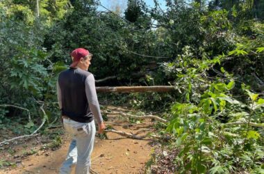 A estrada no meio da floresta, que liga Porto Walter a Cruzeiro do Sul, no Vale do Juruá, foi fechada com vários troncos de árvores