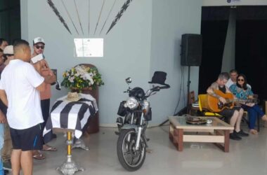 Em cima do caixão a bandeira do Botafogo e um chapéu de couro. Ao lado a moto, a família, amigos e fãs cantando as músicas