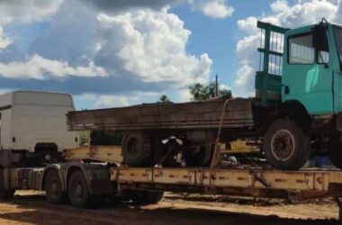 Caminhões e uma retro escavadeira que haviam sido aprendidos pela Polícia Federal e que estavam guardados no pátio do Deracre de Cruzeiro do Sul, estão