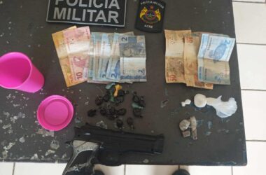Três homens, sendo dois com tornozeleiras eletrônicas, foram presos com cocaína, maconha e um simulacro de arma de fogo pela Polícia Militar em Rodrigues Alves