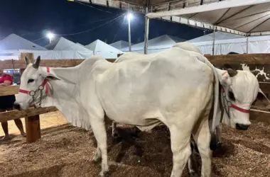 Uma vaca nelore branca de nome Maré, que está exposta na Expoacre Juruá, em Cruzeiro do Sul, custa R$ 150 mil. O bezerro dela vale