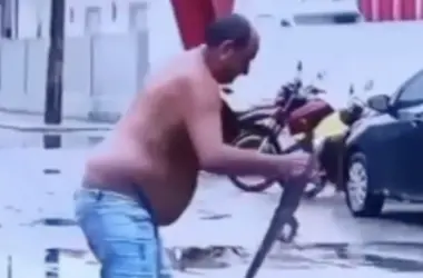 Uma cena inusitada foi registrada em Cruzeiro do Sul nesta terça-feira (20). Um homem capturou um filhote de jacaré em uma poça d’água na Avenida