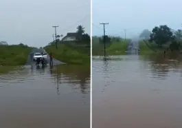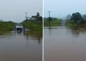 A rodovia AC-407, que dá acesso a Rodrigues Alves, no interior do Acre, segue alagada na tarde desta quinta-feira, 12, em um ponto próximo ao