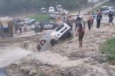 Vídeos que estão circulando nas redes sociais neste domingo, 15, mostram uma caminhonete Hilux caindo nas águas do Rio Abunã durante um temporal que atingiu