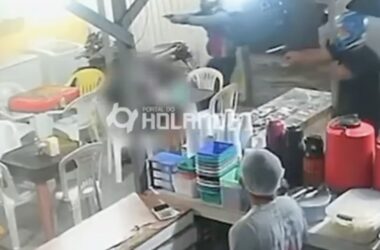 Vídeo publicado pelo Portal do Holanda mostra um trio armado durante um assalto em um restaurante de café regional, neste sábado (28), no bairro Alvorada,