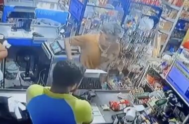 Quatro criminosos em duas motos fizeram arrastam dento de um mercadinho durante assalto na Avenida Nepal, no bairro Nova Cidade, zona Norte de Manaus. A