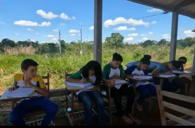 Em pleno 2025, alunos de uma comunidade rural do Acre seguem tendo aula em um antigo curral, sem paredes, sem piso e sem água encanada.