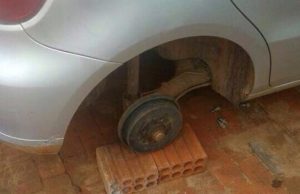 Uma servidora deixou de trabalhar nesta quarta-feira (14) após ter o pneu de seu carro roubado. A foto do veículo sem a roda foi postada