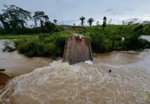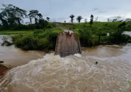As fortes chuvas registradas em Brasileia na terça-feira (27) provocaram o desabamento de mais uma ponte de madeira, desta vez localizada no Ramal do 13,