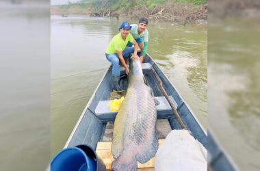 Os irmãos Gilmar e Manoel Silas Bezerra fisgaram um peixe pirarucu com mais de 130 kg e 2,2 metros no Rio Iaco, em Sena Madureira,