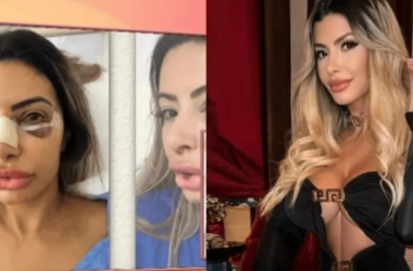 Janaína Prazeres, 35, relatou que sofreu uma tentativa de feminicídio do namorado, Kalel dos Santos Dias, em Paris. A modelo mostrou o rosto com hematomas
