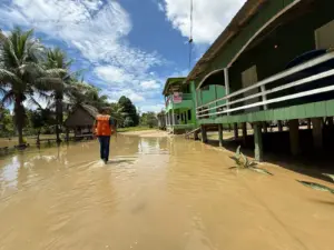 Com a cheia do Rio Juruá, em Cruzeiro do Sul, a Energisa interrompeu o fornecimento de energia elétrica em casas de dois ramais e no