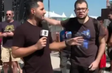 O clima ficou tenso no “RJ1” desta quarta-feira (01). Diretamente da praia de Copacabana, o repórter Leandro Oliveira falava sobre os preparativos para o show