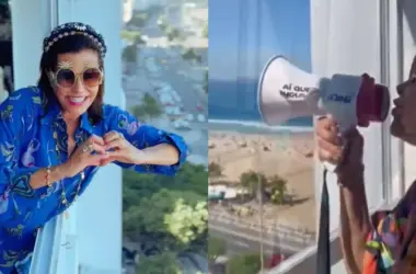 Na terça-feira (30), Narcisa Tomborindeguy divertiu a web ao usar um megafone para tentar falar com Madonna, que está hospedada no Copacabana Palace, Zona Sul