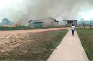 O fogo e a fumaça provocados pela queimada em um roçado ao lado da Escola Estadual de Ensino Fundamental e Médio Magia do Saber, em