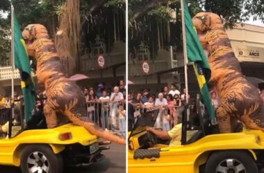 Um homem identificado por “Acresauro”, resolveu participar do desfile cívico em comemoração ao bicentenário da Independência do Brasil, nesta quarta-feira, 7. O dinossauro inflável de