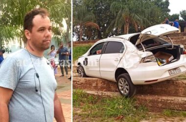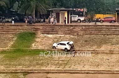 Um veículo de passeio invadiu o Calçadão da Gameleira e acabou caindo na barragem de concreto que fica às margens do Rio Acre, na região