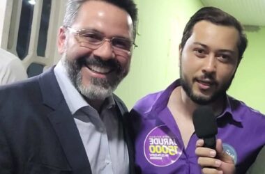 O candidato a deputado estadual Emerson Jarude acompanhou junto com apoiadores, a chegada de Alan Rick, do União Brasil, para a sabatina que ocorre esta